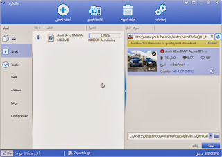 برنامج EagleGet هو برنامج جديد فى قيد التطوير ومتوقع لة بنجاح باهر فى هذا المجال بخصائصة الباهرة والتى تجعلة فى منافسة قوية مع برنامج IDM ومن اهم خصائصة انة برنامج مجانى اولا ناتى لتحميل البرنامج أضغط هنا للتحميل ![]() لضبط لغة البرنامج لتصبح لغة البرنامج العربية اتبع الاتى : افتح واجهة البرنامج ثم اضغط على السهم اعلى واجهة البرنامج مثل الصورة ![]() ونقوم باختيار Language ثم نختار اللغة العربية ![]() لأضافة رابط تحميل لاى ملف نختار ايقونة اضف تحميل ![]() فى الخانة الاولى نضع رابط التحميل ومن اخر خانة نضغط على شكل المربع ونختار مكان التحميل ثم نضغط على كلمة تحميل ![]() لتحميل فيديو سواء من اليوتيوب او من اى موقع اخر نختار التقاط الفيديو ![]() ثم نضع رابط التحميل فى القائمة التى ظهرت فى يمين البرنامج ونضغط على السهم ![]() سوف يقوم البرنامج بالبحث عن الفيديو المرات تحميلة ![]() قم بالضغط على المربع الصغير لتاكيد جودة الفيديو ![]() ثم اضغط على كلمة تحميل http://3.bp.blogspot.com/-SsT6iO1sFg...3-45-01+PM.jpg ![]() المصدر : برنامج EagleGet لتحميل الملفات المنافس لبرنامج IDM أكثر... |